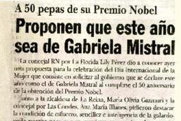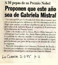 Proponen que este año sea de Gabriela Mistral A 50 pepas de su Premio Nobel. [artículo] / La Cuarta (Diario : Santiago, Chile)-- mar. 2, 1995, p. 2. .
