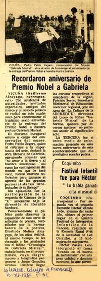 Recordaron aniversario de Premio Nobel a Gabriela [artículo] Guillermo Alcayaga.