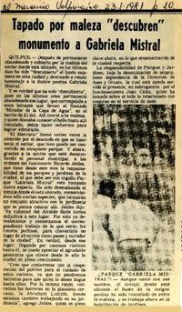 Tapado por maleza "descubren" monumento a Gabriela Mistral [artículo] El Mercurio (Valparaíso, Chile)-- ene. 23, 1981, p. 10. retr. .