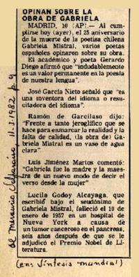 Opinan sobre la obra de Gabriela [artículo] El Mercurio (Valparaíso, Chile)-- ene. 2, 1982, p. 9. .