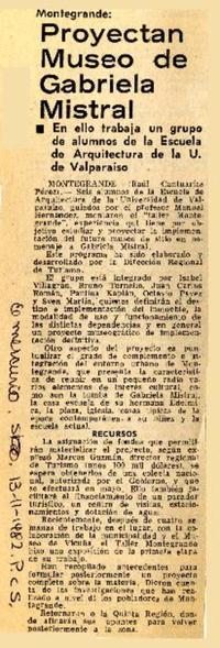 Proyectan Museo de Gabriela Mistral [artículo] El Mercurio (Santiago, Chile)-- feb. 13, 1982, p. C5. .