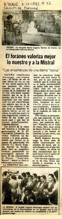 El foráneo valoriza mejor lo nuestro y a la Mistral [artículo] La Tercera de la Hora (Diario : Santiago, Chile)-- abr. 8, 1982, p. 33 (Edición de Provincia) retr. .