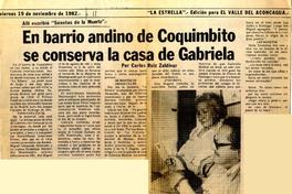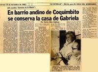 En barrio andino de Coquimbito se conserva la casa de Gabriela [artículo] / Carlos Ruíz Zaldivar. La Estrella (Aconcagua, Chile)-- nov. 19, 1982, p. 11. retr. .