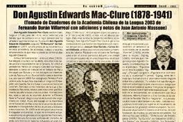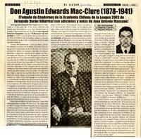 Don Agustín Edwards Mac-Clure (1878-1941) / [artículo] (tomado de Cuadernos de la Academia Chilena de la Lengua 2003 de Fernando Durán Villarreal con adiciones y notas de Juan Antonio Massone) por Jaime Gatica Jorquera. El Lector (Diario : Linares, Chile) enero 2, 2005, p. 4. .