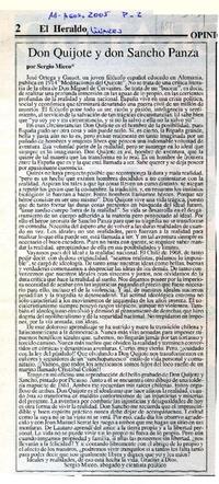 Don Quijote y don Sancho Panza. [artículo] Sergio Micco. El Sur (Diario : Concepción, Chile)-- ago. 9, 2005, p. 2 El Heraldo (Diario: Linares, Chile) ago. 11, 2005, p. 2 .
