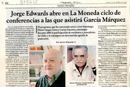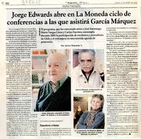 Jorge Edwards abre en la Moneda ciclo de conferencias a las que asistirá García Márquez [artículo] / por Javier Ibacache V. la Segunda (Diario : Santiago, Chile) marzo 2005, p. 60. .