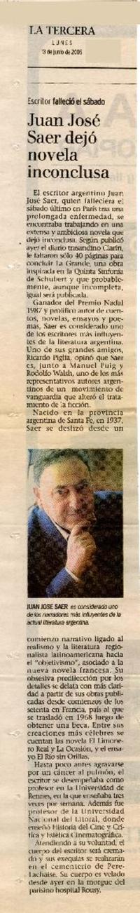 Escritor falleció el sábado : Juan José Saer dejó novela inconclusa [artículo]