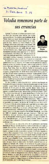 Volodia rememora partes de sus errancias [artículo] / Wellington Rojas Valdebenito. La Prensa (Curicó: Diario) feb. 3, 2006, p. 19. .
