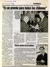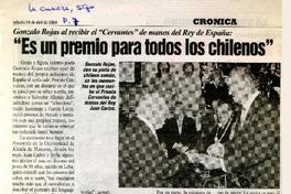 Gonzalo Rojas al recibir el "Cervantes" de manos del Rey de España: "Es un premio para todos los chilenos" [artículo]. La Cuarta (Diario : Santiago, Chile)-- abr. 24, 2004, p. 7. .