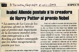 Isabel Allende postula a la creadora de Harry Potter al premio Nobel [artículo]. El Atacama (Copiapo, Chile)-- dic. 2, 2003, p. 22. .
