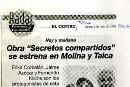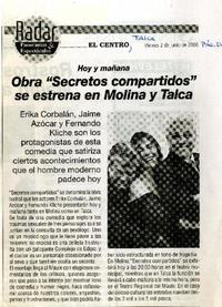 Obra "Secretos compartidos" se estrena en Molina y Talca [artículo] El Centro (Talca, Chile) jun. 2, 2006, p. 24. .