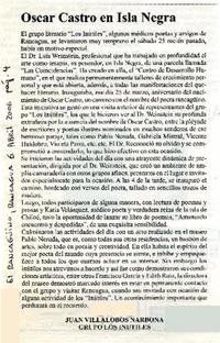 Oscar Castro en Isla Negra [artículo] / Juan Villalobos Narbona. El Rancagüino (Diario: Rancagua, Chile) abr. 6, 2006, p. 4. .
