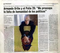 Armando Uribe y el Patio 29: "Me preocupa la falta de humanidad de los políticos" (entrevistas) [artículo] / Guillermo Muñoz. Las Últimas Noticias (Diario : Santiago, Chile)-- abr. 30, 2006, p. 10. .