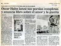 Oscar Hahn lanza sus poesías completas y anuncia libro sobre el amor y la guerra [artículo] / Andrés Gómez Bravo. La Tercera (Diario : Santiago, Chile) jul. 13, 2006, p. 40. .