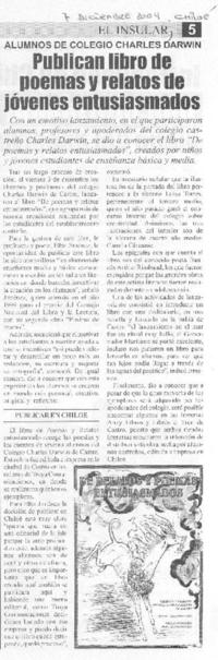 Publican libro de poemas y relatos de jóvenes entusiasmados [artículo]. El Insular (Diario : Chiloé, Chile)-- dic. 7, 2004, p. 5. .