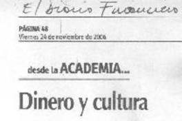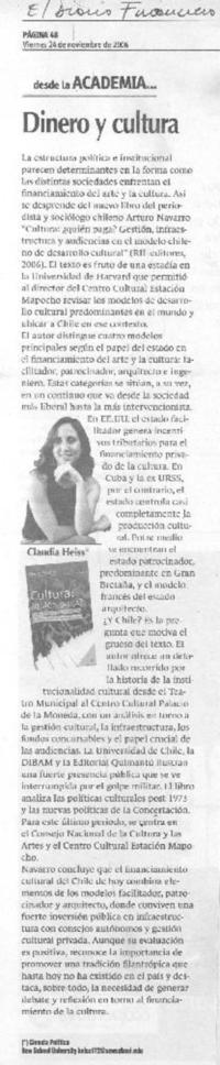 Dinero y cultura [artículo] / Claudia Heiss. El Diario Financiero (Diario : Santiago, Chile)-- nov. 24, 2006, p. 48. .