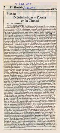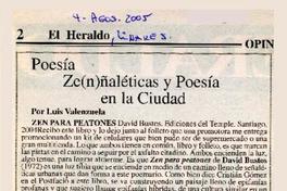 Poesía Ze(n)ñaléticas y poesía en la ciudad [artículo]/ Luis Valenzuela. El Heraldo (Diario: Linares, Santiago) ago. 4, 2005, p. 2 .