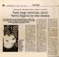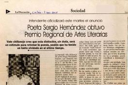 Poeta Sergio Herández obtuvo Premio Regional de Artes Literarias [artículo] La Discusión (Diario: Chillán, Chile) nov. 7, 2005, p. 4 .