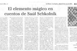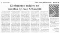 El elemento mágico en cuentos de Saúl Schkolnik [artículo] / Irma Lagos. La Tribuna (Diario : Los Angeles, Chile)-- ene. 27, 2007, p. 2. .