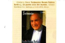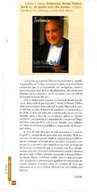 Testimonios: Renato Poblete Barth s. j., Un puente entre dos mundos [artículo]/ E.A.M. Mensaje (Santiago, Chile) no. 540 (jul. 2005) p. 56 .