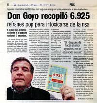 Don Goyo recopiló 6.925 refranes pop para intoxicarse de la risa (entrevista) [artículo]/ Sebastián Foncea M. La Cuarta (Diario : Santiago, Chile)-- oct. 16, 2006, p. 6. .