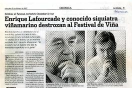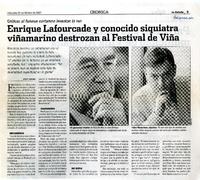 Enrique Lafourcade y conocido siquiatra viñamarino destrozan al Festival de Viña [artículo] / Jenny Bruna. La Estrella (Diario : Valparaíso, Chile)-- feb. 21, 2007, p. 9. .