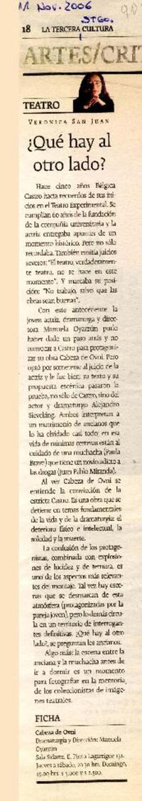 ¿Que hay al otro lado? [artículo]/ Verónica San Juan. La Tercera (Diario: Santiago, Chile) nov. 11, 2006, p. 18 .