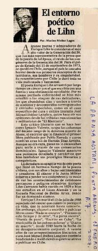 El entorno poético de Lihn [artículo]/ Marino Muñoz Lagos. La Prensa Austral (Punta Arenas, Chile) ene. 18, 2007, p. 7 .