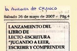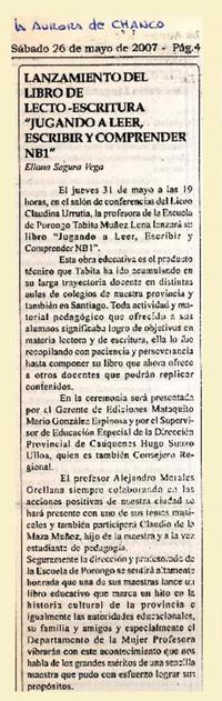 Lanzamiento del libro de lecto-escritura "Jugando a leer, escribir y comprender NB1" [artículo] La Aurora (Chanco, Chile) maryo 26, 2007, p. 4 .