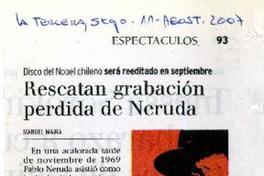 Rescatan grabación perdida de Neruda [artículo]/ Manuel Maira. La Tercera (Diario: Santiago, Chile) ago. 11, 2007, p. 93 .