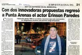 Con dos innovadoras propuestas regresó a Punta Arenas el actor Erinson Paredes [artículo]. La Prensa Austral (Diario : Punta Arenas, Chile)-- ago. 17, 2007, p. 21. .