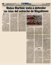 Mateo Martinic insta a defender las islas del estrecho de Magallanes [artículo]. La Prensa Austral (Diario : Punta Arenas, Chile)-- ago. 24, 2007, p. 40. .