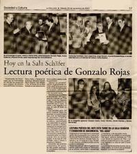 Lectura poética de Gonzalo Rojas [artículo]. La Discusión (Chillán, Chile) nov. 24, 2007, p. 17 .