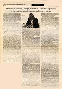 Manuel Mauricio Zúñiga, autor del Libro In-Digentes: "Nuestra sociedad---enferma hasta el alma" [artículo]. El Divisadero (Aysén, Chile) feb. 23, 2008, p. 6 .