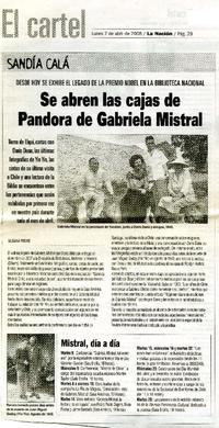 Se abren las cajas de Pandora de Gabriela Mistral [artículo]/ Susana Freire. La Nación (Diario: Santiago, Chile) abr. 7, 2008, p. 29 .