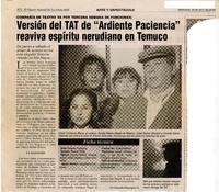 Versión del TAT de "Ardiente Paciencia" reaviva espíritu nerudiano en Temuco [artículo] / Eduardo Henríquez O. El Austral (Araucanía, Chile)-- abr. 16, 2008, p. A22. .