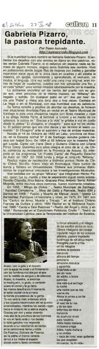 Gabriela Pizarro, la pastora trepidante [artículo] / Nano Acevedo. El Siglo (Diario : Santiago, Chile)-- feb. 22, 2008, p. 11. .