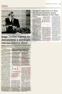 Jorge Teillier regresa en documental y antología con sus últimos libros [artículo]/ Roberto Careaga. La Tercera (Diario: Santiago, Chile) nov. 4, 2008, p. 45 .