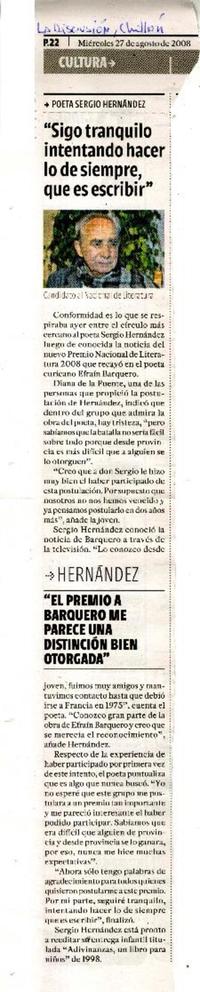 "Sigo tranquilo intentando hacer lo de siempre, que es escribir" [artículo]. La Discución (Chillán, Chile) ago. 27, 2008, p. 22 .