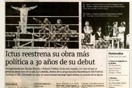 Ictus reestrena su obra más política a 30 años de su debut [artículo] / Rodrigo Miranda. La Tercera (Diario: Santiago, Chile)-- ene. 6, 2010, p. 44. .