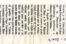 Entregan objetos de Mistral a Museo de Vicuña [artículo] Pablo Portilla.