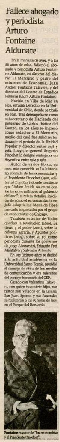 Fallece abogado y periodista Arturo Fontaine Aldunate [artículo]. La Tercera (Diario : Santiago, Chile)-- mayo 18, 2010, p. 9. .