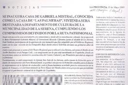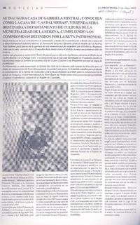 Se inaugura casa de Gabriela Mistral, conocida como la casa de "las palmeras" [artículo]. La Provincia del Choapa (Diario : Illapel, Chile)-- mayo 19, 2009, p. 10. .