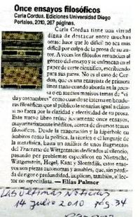 Once ensayos filosóficos [artículo] / Elías Palmer. Las Últimas Noticias (Diario : Santiago, Chile)-- jul. 14, 2010, p. 34. .