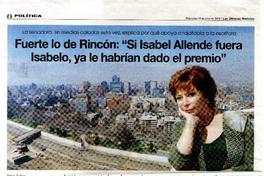 Fuerte lo de Rincón: "Si Isabel Allende fuera Isabelo, ya le habrían dado el premio" [artículo] / Diego Zúñiga. Las Últimas Noticias (Diario : Santiago, Chile)-- jul. 14, 2010, p. 8-9. .