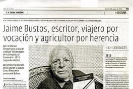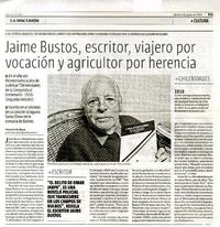 Jaime bustos, escritor, viajero por vocación y agricultor por herencia [artículo] / Patricia Orellana. La Discusión (Diario : Chillán, Chile)-- jun. 3, 2010, p. 21. .