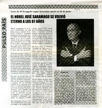 El Nobel José Saramago se volvió eterno a los 87 años [artículo]. Diario uno (Diario : Santiago, Chile)-- jun. 20, 2010, p. 6. .