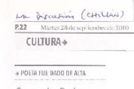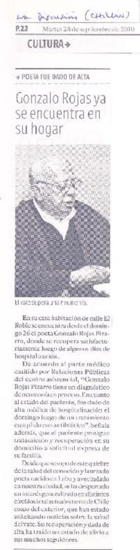 Gonzalo Rojas ya se encuentra en su hogar [artículo]. La Discusión (Diario : Chillán, Chile)-- sept. 28, 2010, p. 22. .