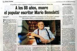 A los 88 años, muere el popular escritor Mario Benedetti [artículo]. Las Ultimas Noticias (Diario : Santiago, Chile)-- mayo 18, 2009, p. 42. .