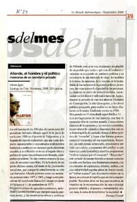 Allende, el hombre y el político [artículo] / Pierina Ferretti. Le Monde diplomatique (Revista : Chile)-- no. 89 (sept., 2008) p. 39. .